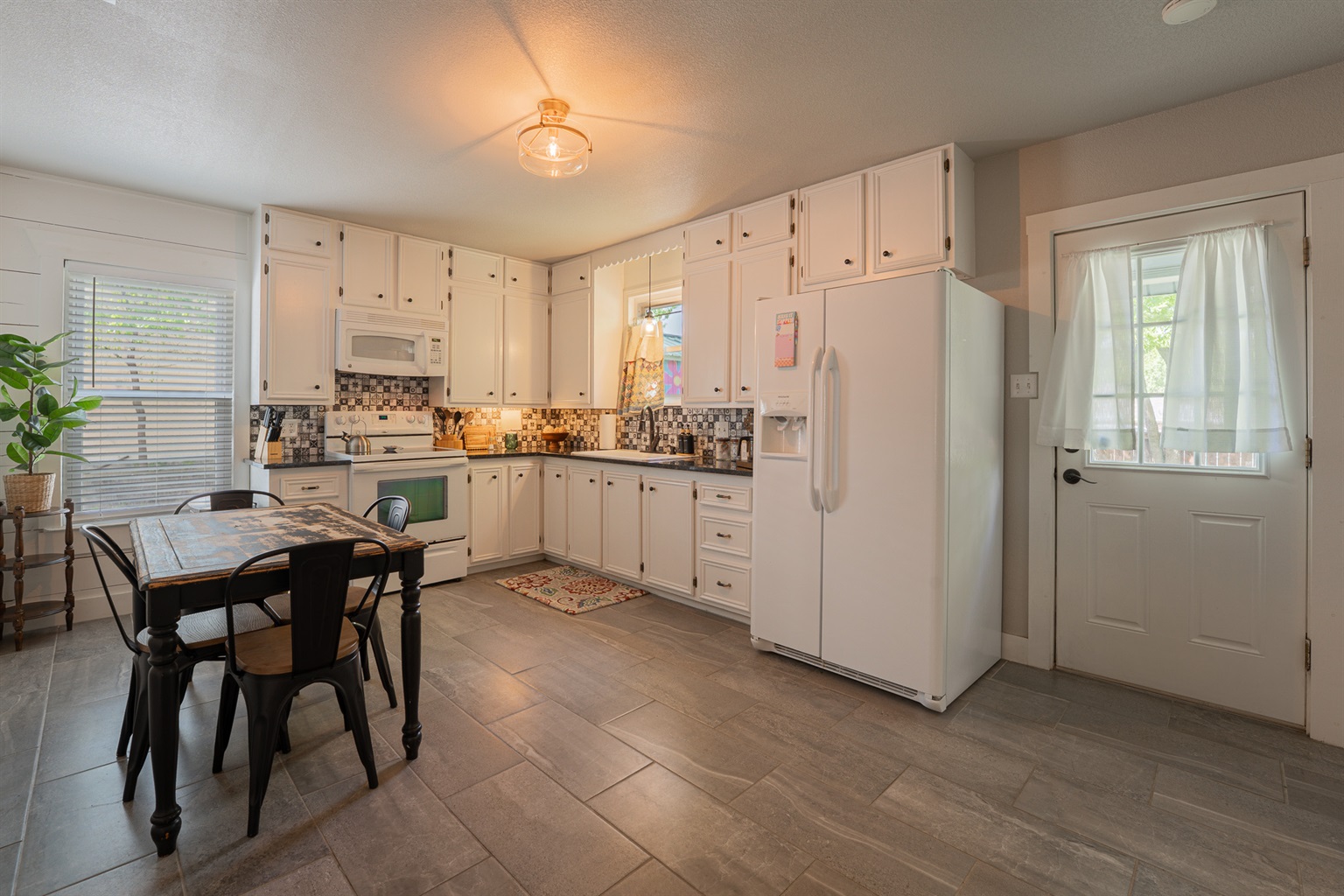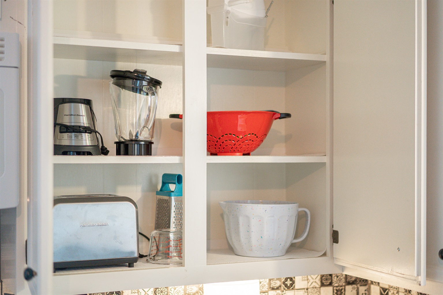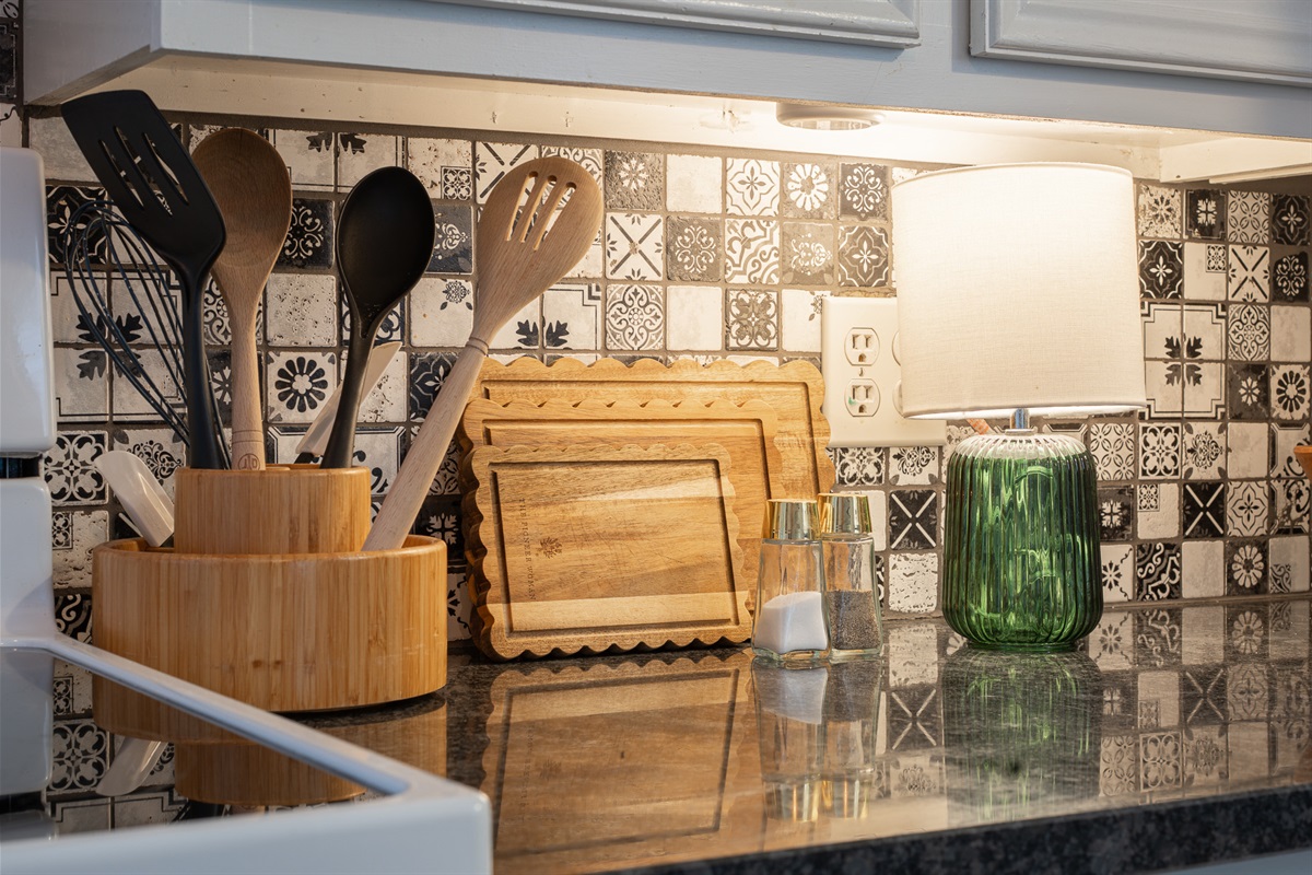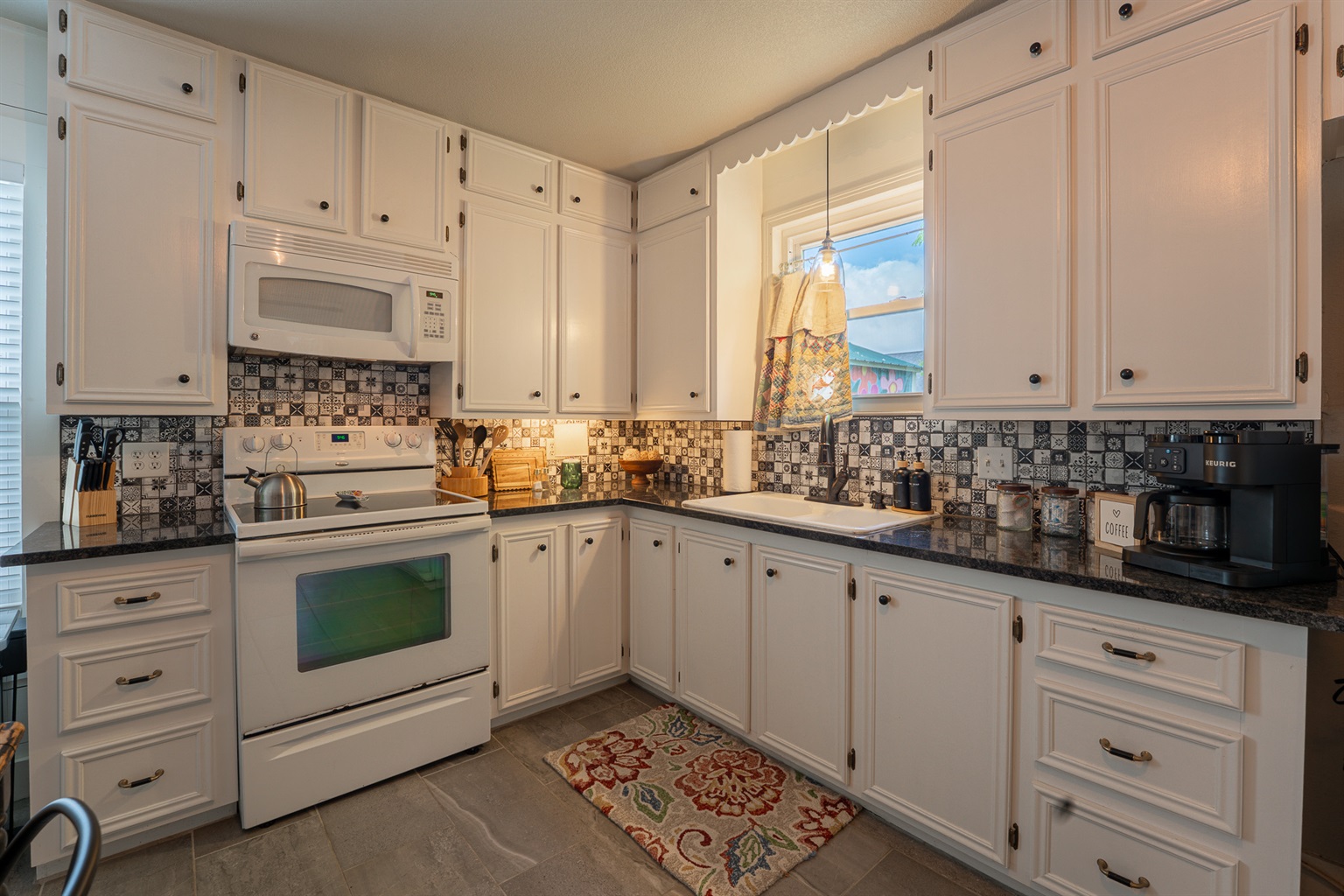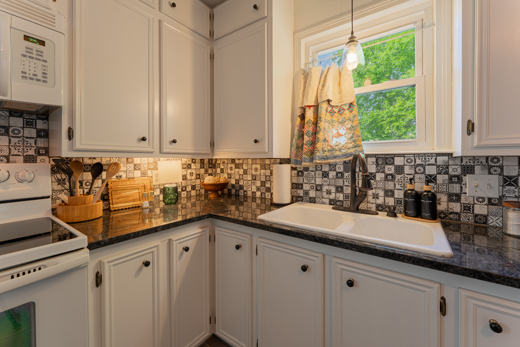 Located at the back of the house with a view of the fenced backyard and a colorful mural by a local artist on the storage shed. The kitchen is fully stocked with all essentials needed to cook meals at home. *The storage shed is locked and used for owner supplies and linens
