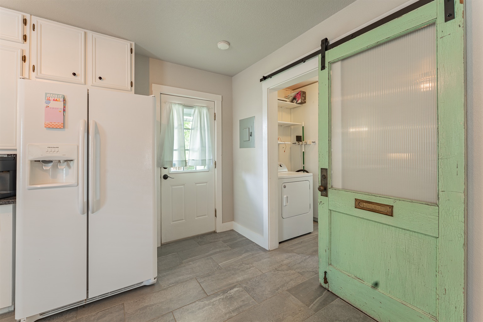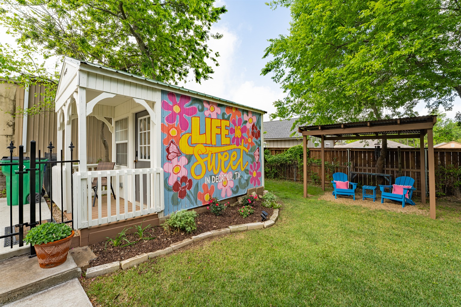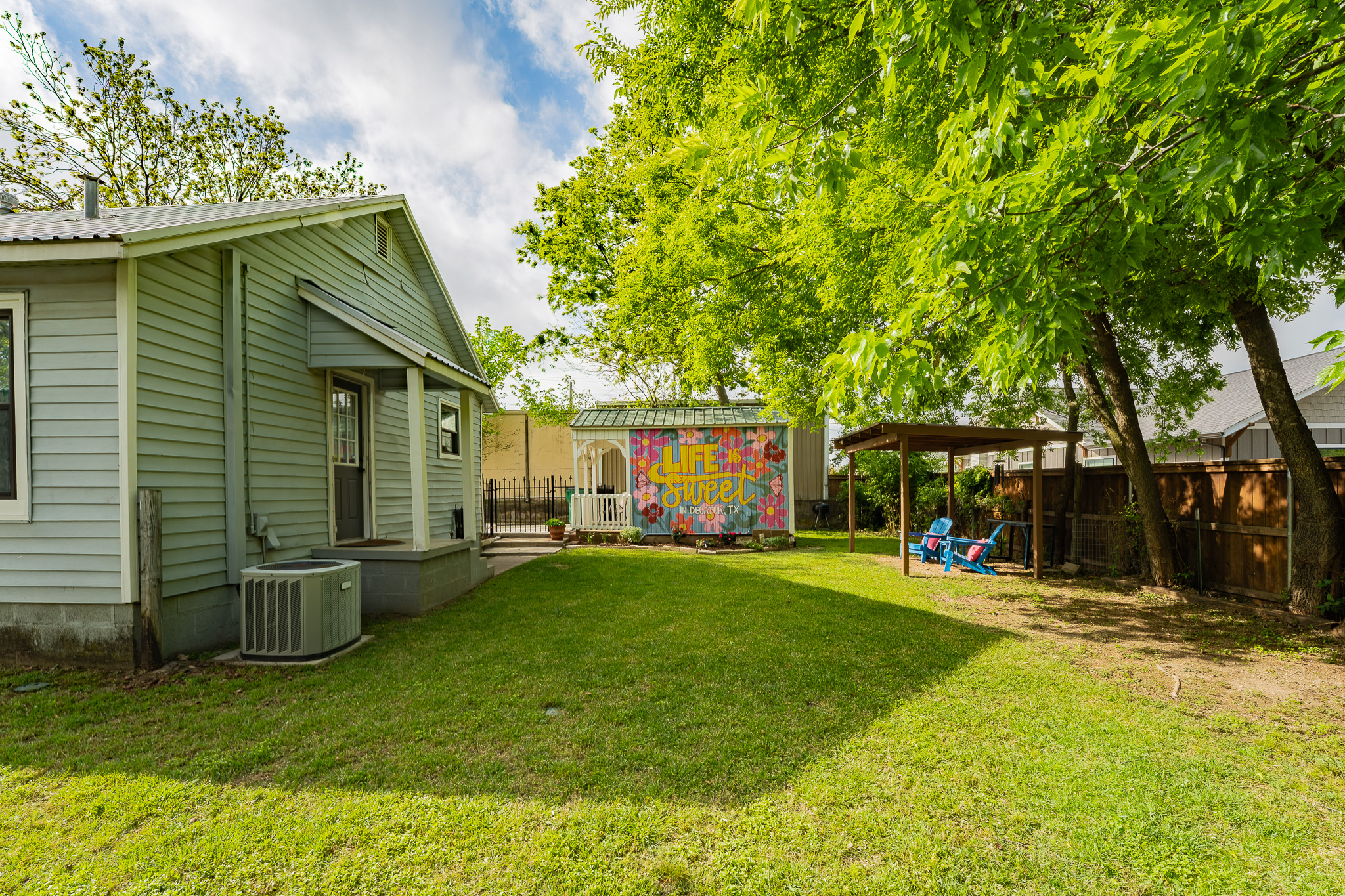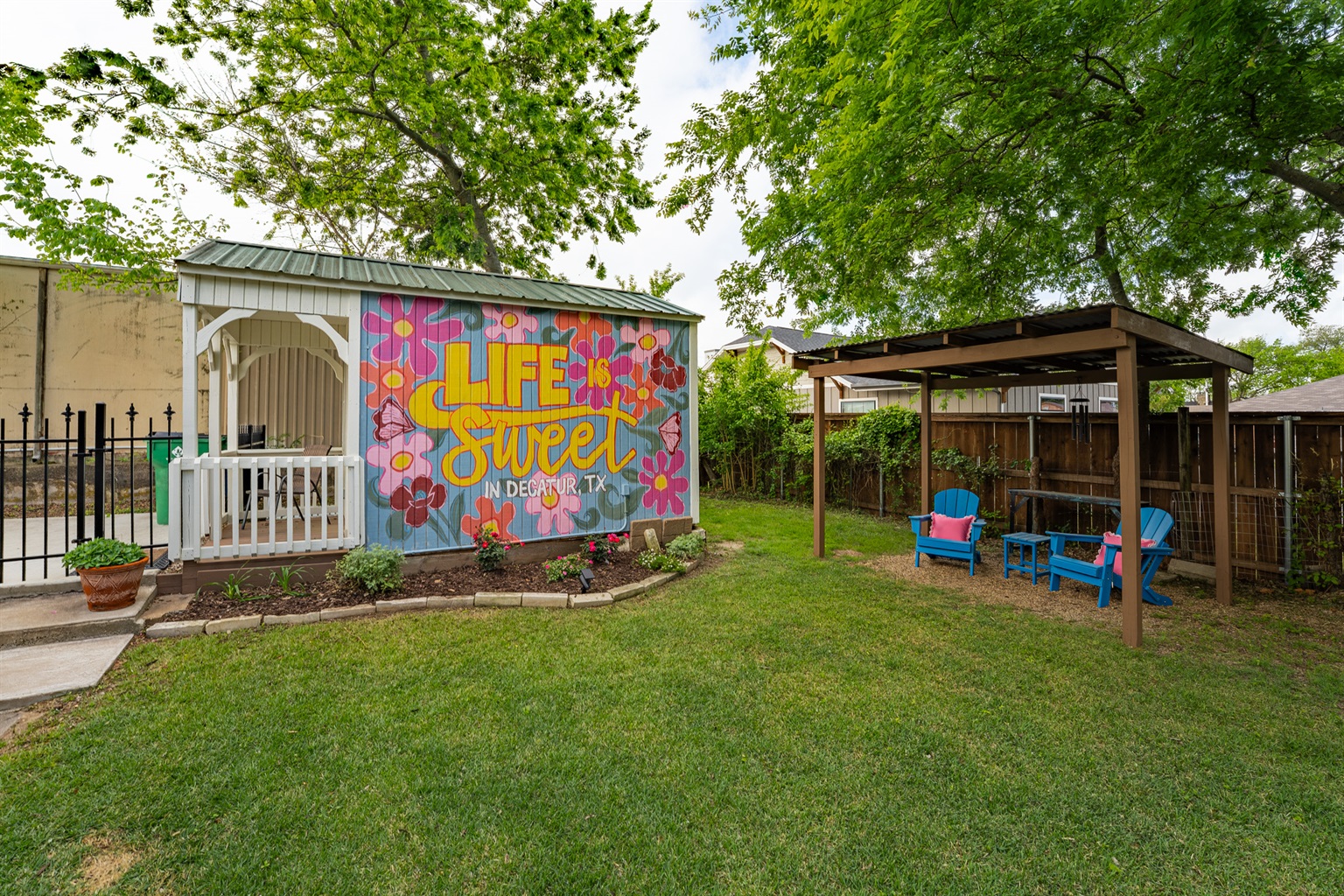 Located at the back of the house with a view of the fenced backyard and a colorful mural by a local artist on the storage shed. The kitchen is fully stocked with all essentials needed to cook meals at home. *The storage shed is locked and used for owner supplies and linens