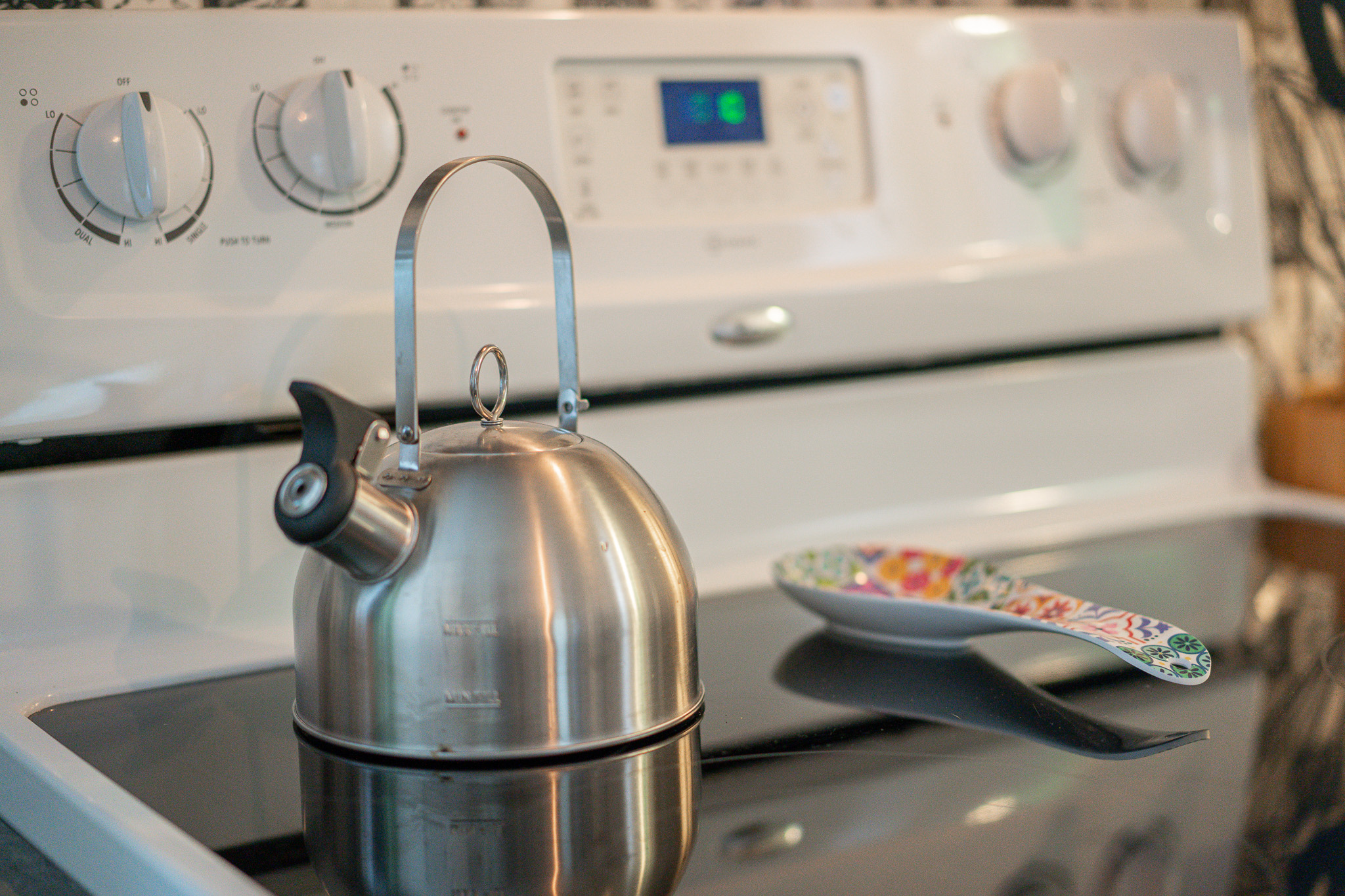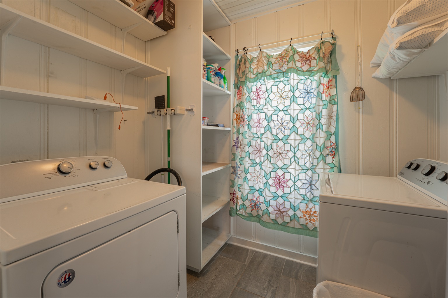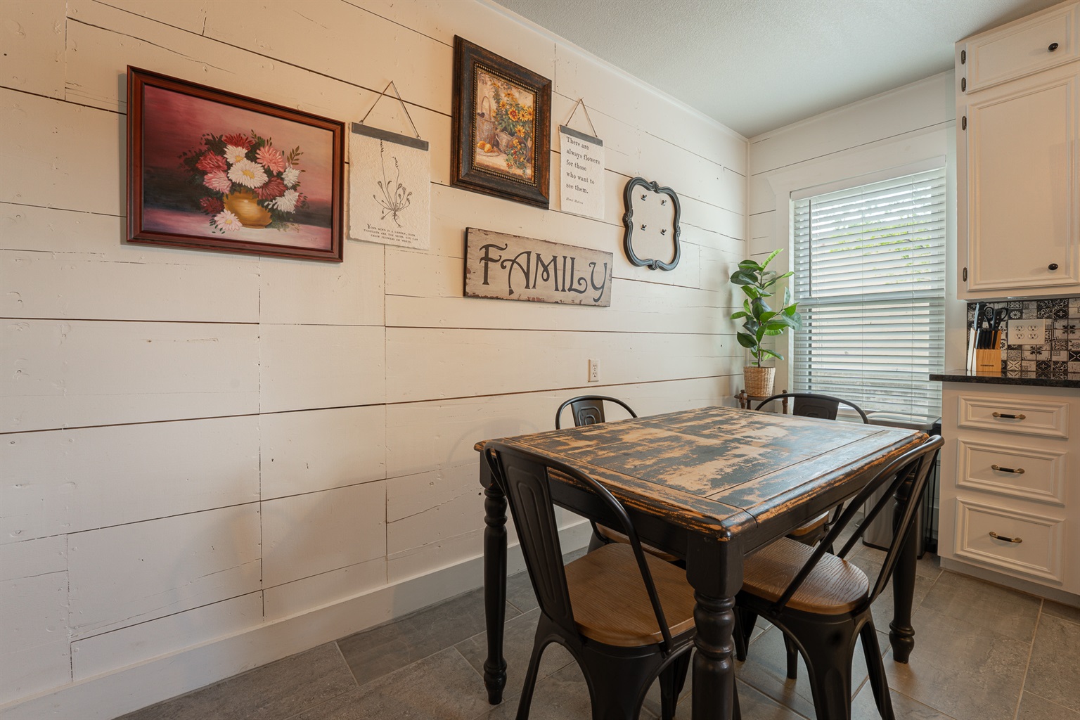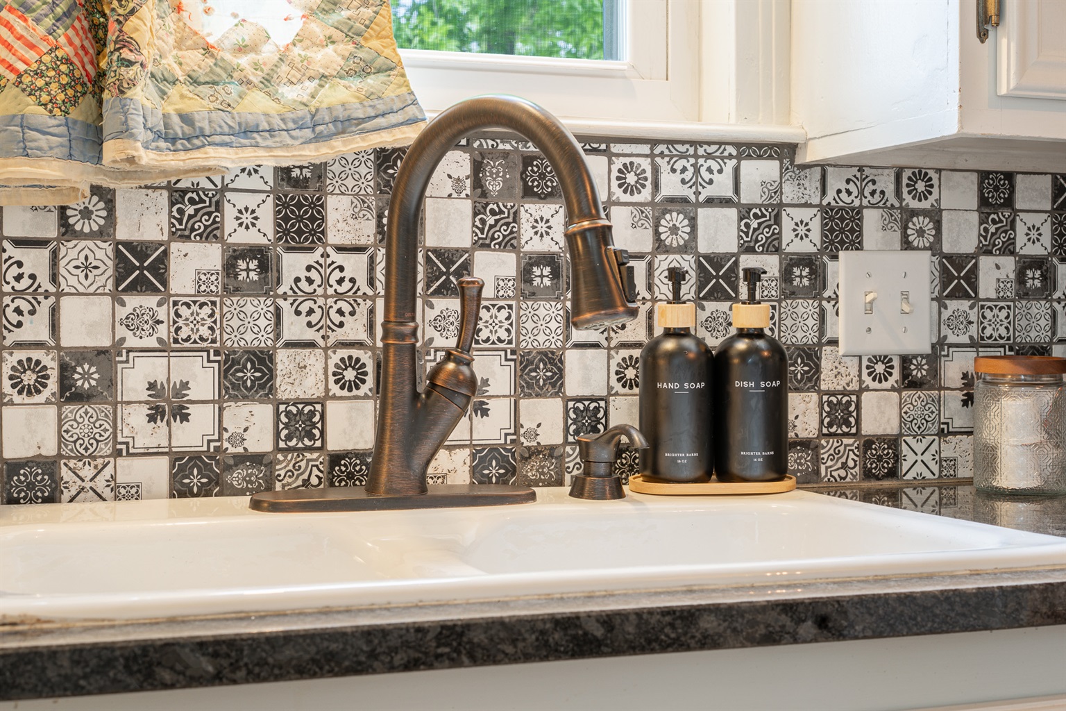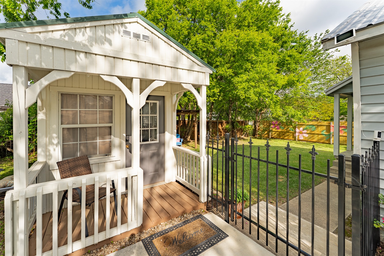 Located at the back of the house with a view of the fenced backyard and a colorful mural by a local artist on the storage shed. The kitchen is fully stocked with all essentials needed to cook meals at home. *The storage shed is locked and used for owner supplies and linens