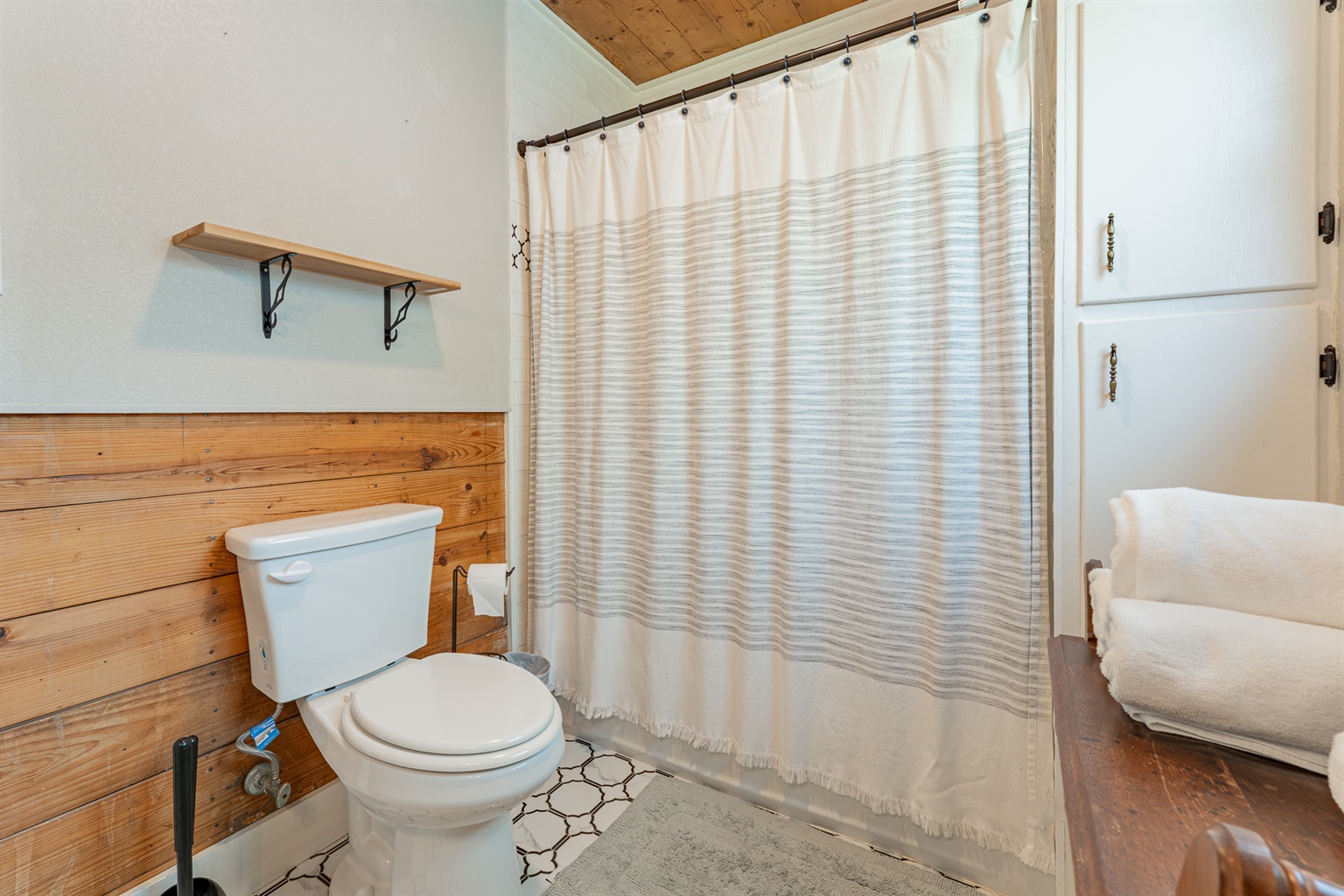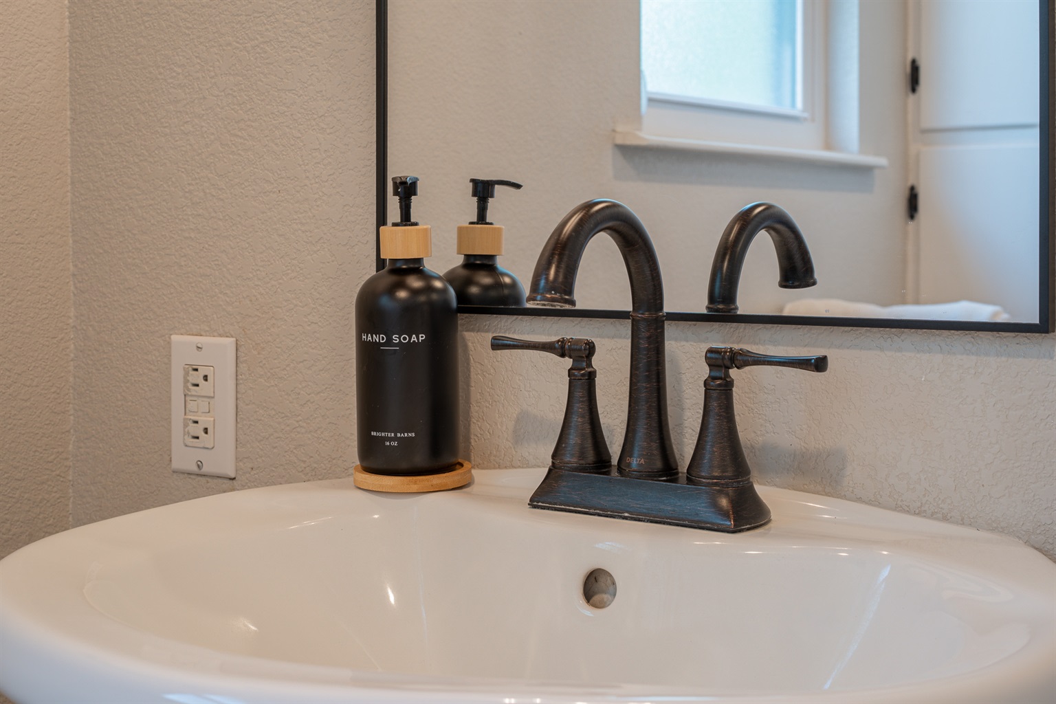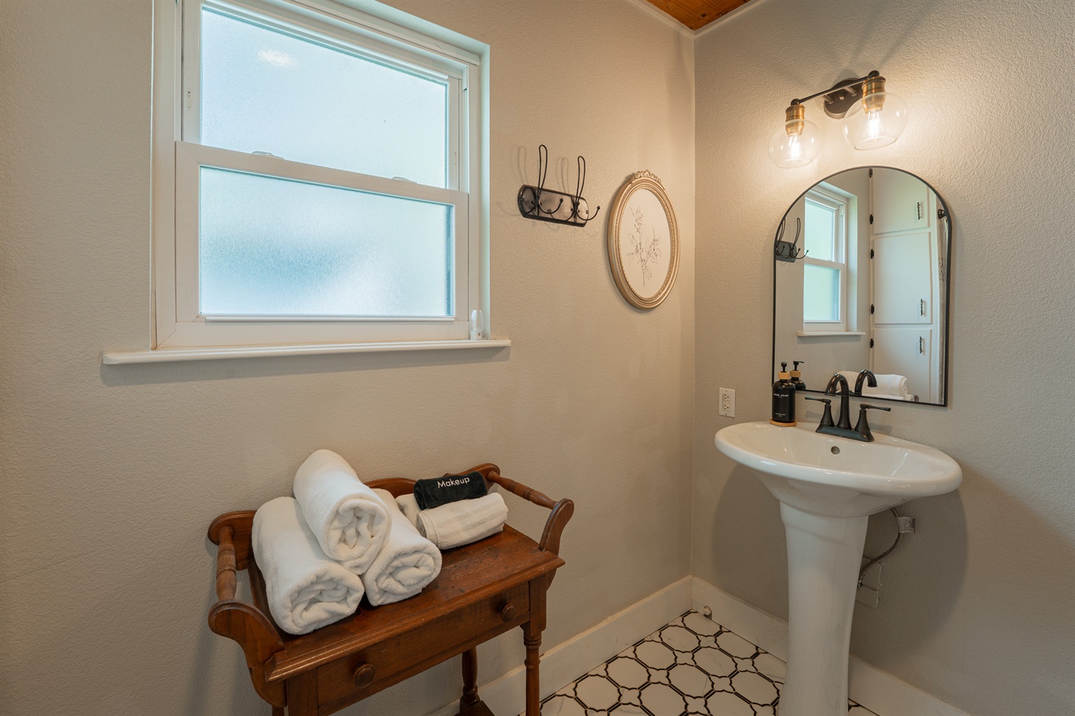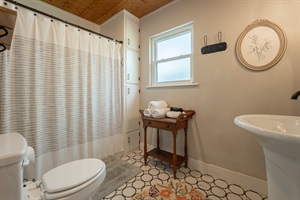 -Bathroom: Located off the hallway; features a tub/shower combo, pedestal sink, and toilet. *We provide bottles of shampoo, conditioner, and body wash for your stay.